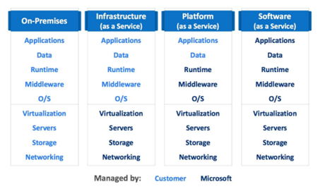 Désolé pour l’interlude anglophone, mais vous comprendrez par ce graphique que plus vous avancez dans votre périple infonuagique, d’abord en mode infrastructure, plateforme ou logiciel en tant que service, plus Microsoft prend en charge des couches d’exploitation.